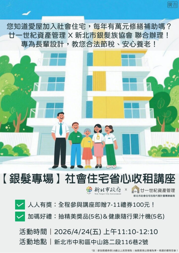 您還在為漏水維修、催繳租金、繁瑣稅務煩惱嗎?廿一世紀資產管理與新北市銀髮族協會攜手,在本週五舉辦專為房東量身打造的「省心收租」實務講座。本活動完全免費、免預約、免報名,只要您想了解如何領取政府補助、合法節稅,歡迎直接到場參加!